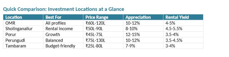 Quick Summary: OMR (best overall), Sholinganallur (rental income), Porur (emerging growth), Perungudi (strategic advantage), Tambaram (budget-friendly).